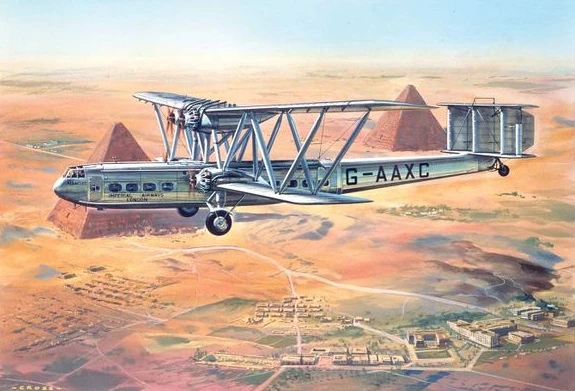 An elegant four engined biplane airliner from the early days of passenger air travel, the Handley Page H.P 42 was designed to serve the Empire air routes into the Middle East, Africa and India, carrying its passengers in some style. With the engines mounted well away from the passenger cabin, travel in the H.P 42 was relatively quiet and likened to travelling in a first class pullman railway carriage, which is just as well, because the aircraft’s cruising speed of just 105 mph meant that any journey was likely to be a long one. The pride of Britain’s pioneering Imperial Airways fleet, this giant airliner was an attempt to regain passenger flight supremacy from the German aviation industry and at the time of its introduction, it had the distinction of being the largest passenger aircraft in regular use in the world. In total, only eight of these magnificent machines were ever built, four with larger freight and mail carrying capabilities to serve the longer range Eastern Empire routes, with a further four designated H.P 45 built to carry more passengers and intended for use on European routes – two of these would later be converted to H.P.42 configuration. Crucially, these majestic aircraft would achieve an exemplary safety record, carrying many thousands of passengers safely at a time when scheduled air travel was still in its relative infancy.