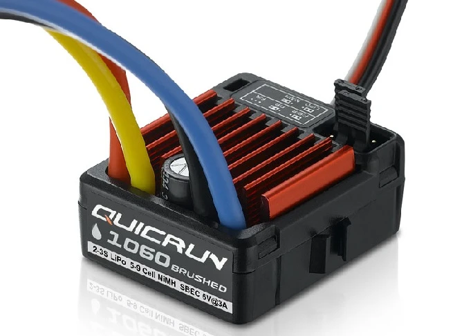 The QuicRun WP 1060 is specially designed for new beginners and intermediate modelers. This speed controller is designed for 1/10th scale touring cars buggies short-course trucks monster trucks trucks crawlers and tanks. Reliable hardware combined with advanced software technology allows the QUICRUN WP 1060 Brushed to not only provide high power output but also overload protection of the ESC circuit. The waterproof and dust-proof design allows the QUICRUN WP-1060 Brushed to be used in all weather conditions without any issue of damage caused to the ESC from water or dust. HobbyWing QuicRun WP 1060 Features: High Reliability & Durability Easy to Use Great Flexibility & Versatility Applicable to All Weather Conditions Spec Check: Scale: 1/10th Brushed/Brushless: Brushed Waterproof: Yes Cont./Peak Current: 60A/360A Input: 2-3S LiPo/6-9 Cells NiMH BEC Output: Linear Mode:6V/3A Input Wires: Red-16AWG-100mm*1/Black-16AWG-100mm*1 Output Wires: Blue-16AWG-100mm*1/Yellow-16AWG-100mm*1 Input Connectors: Big-sized TAMIYA Connector Output Connecotors: 4.0 Bullet Connectors (Female) Size: 36.5x32x18.0mm Weight: 39g