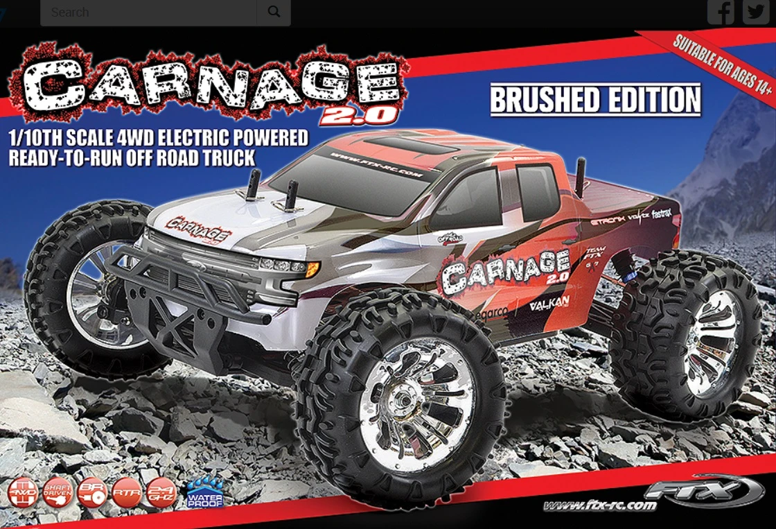 Since itβs release over six years ago the FTX Carnage has become a huge favourite with beginners looking for an affordable entry into the world of R/C. Well we thought it was about time this fan favorite had a face lift with the Carnage 2.0. Two new bodyshell schemes and colours, chrome plated wheels, Etronix 3ch radio and a new 60amp rated brushed esc means the Carnage legacy is set to continue for a long time to come!