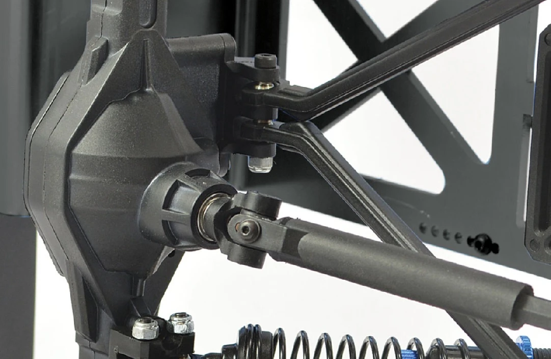 The high torque 60T brushed motor drives a rugged, all metal output pinion, crown and transmission gears for extra reliability. Front universal CVA driveshafts and centre telescopic sliding shafts keep the power connected to all wheels through high clearance front and rear locked axles.