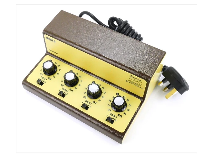 Four Track controller for N or OO.Input: Mains (240v A.C.) use 3amp fuse Output: 4 x 12v D.C. at 1 amp each controlled Accessories: 2 x 16v A.C. at 1 amp2 x 12v D.C. at 1 amp uncontrolled Measurements: 208mm x 90mm x 147mm deep Weight: 3.135kg