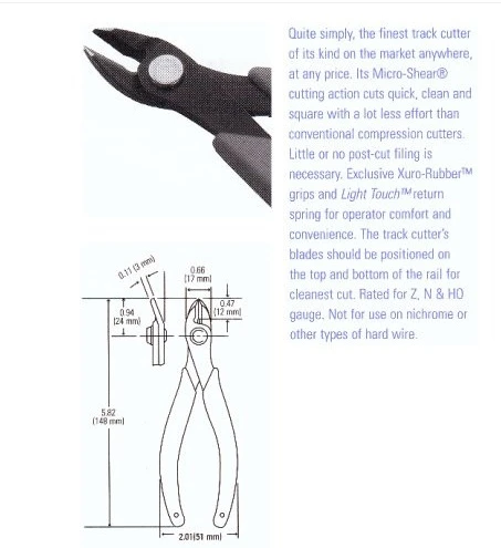 2175B -Track Cutter A favorite of model railroaders worldwide. Xuron®’s Micro-Shear® cutting action leaves clean square cuts on both brass and nickel silver track – sizes HO, N and Z (code 100). For best results, position track in the center of the jaws (top to bottom). Not for use on nichrome or other types of hard wire. Type of Tool: Cutter Project type: Model Railroading Special Features: Semi-Flush Cutting Wire size: 30 29 28 27 26 25 24 23 22 21 20 19 18 17 16 15 14 13 12 Material(s): Wire Silver Wire Plastic Cable Ties Picture Framing Wire Model Railroad Track – Ho, Z & N Gauge Gold Wire Floral Wire Electrial Wire Craft Wire Copper Wire Annealed Wire
