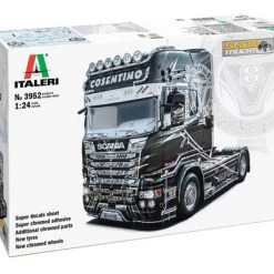 The Scania R series heavy tractor was developed on the current needs of the world market. SCANIA engines are built to carry out the most demanding jobs and highly appreciated as they are robust, reactive and efficient. The Scania R Series is designed to meet the highest demands in terms of fuel economy and reliability. The exterior design gives the vehicles an imposing appearance on the road and is considered the number one for making fantastic “SHOW TRUCKS”, the famous decorated tractors. The extraordinary styling of the exterior is combined with exclusive new interiors that offer exceptional comfort for the driver and a wide range of color and material options. Our model is also completed by a fantastic decals sheet and an accurate sheet of metallic adhesives, ready for application, for a correct finish of the tractor. In addition, the package contains new chromed plastic parts to make the model particularly realistic.
