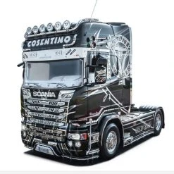 The Scania R series heavy tractor was developed on the current needs of the world market. SCANIA engines are built to carry out the most demanding jobs and highly appreciated as they are robust, reactive and efficient. The Scania R Series is designed to meet the highest demands in terms of fuel economy and reliability. The exterior design gives the vehicles an imposing appearance on the road and is considered the number one for making fantastic “SHOW TRUCKS”, the famous decorated tractors. The extraordinary styling of the exterior is combined with exclusive new interiors that offer exceptional comfort for the driver and a wide range of color and material options. Our model is also completed by a fantastic decals sheet and an accurate sheet of metallic adhesives, ready for application, for a correct finish of the tractor. In addition, the package contains new chromed plastic parts to make the model particularly realistic.
