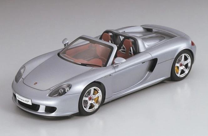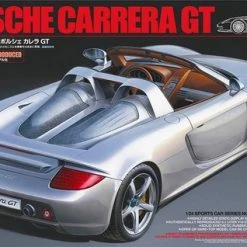 This Tamiya assembly kit recreates the Porsche Carrera GT in 1/24 scale. The Porsche Carrera GT first grabbed grabbed the world’s attention when first unveiled as a concept car at the 2000 Paris Auto Show. Promoted as Porsche’s next generation flagship super sports car, the Carrera GT was officially unleashed onto the international motoring market in 2003. Incorporating the latest and most extreme racing technology, the Carrera GT lines up against the impressive range of super sports cars offered by the worlds top makers, such as the Enzo Ferrari and the Mercedes-Benz SLR McLaren. Featuring a powerful 5.7 liter V10 engine, carbon-fiber monocoque chassis and push-rod suspension all wrapped up in classic Porsche style and elegance, the Carrera GT is the ultimate high-end sports car.