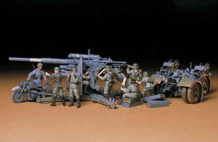 This is a 1/35 scale plastic model assembly kit depicting the feared German Flak36/37 88mm gun from WWII. ★Over three hundred parts are used to build up this realistic kit. ★Moving parts allow elevation and rotation of the gun, while the trailer is screw-attached. ★Comes with a motorcycle model and no less than nine figures in action pose.