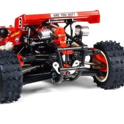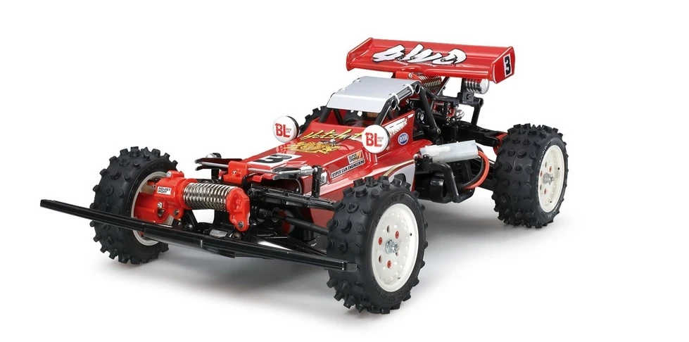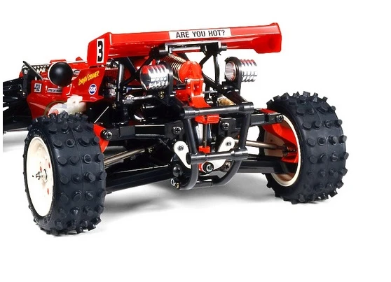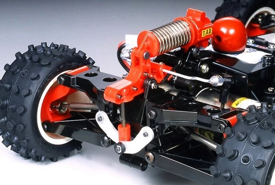Tamiya designers have given the Hotshot a makeover, replacing older, harder to assemble parts with modern equivalents but still keeping true to the spirit of the original Hotshot. While the front/rear double wishbone suspensions and adjustable mono-shock oil dampers remain the same, the drivetrain features modern dog bone type propeller shafts for enhanced reliability. The oil dampers have also been changed to the more modern diaphragm type. Also, with the use of a modern ESC, the original Hotshot’s rear aluminum heat sink was no longer necessary. However, the Hotshot would not look the same without it, so our solution was to install a dummy part to remain faithful to the original look. Take this updated Hotshot out for a spin and compare it to today’s R/C buggies to experience how far this hobby has developed!Specifications