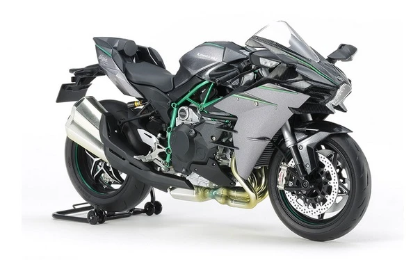 This is a 1/12 scale plastic model assembly kit. Length: 174mm, width: 76mm, height: 96mm. ★Features a realistic depiction of the inline-4 engine and supercharger. ★H2 road bike spec upper cowl with headlight and mirrors, side cowls and rear cowls really capture the bike’s aerodynamics in style. ★Metal-plated parts are used to recreate muffler, light cases and more. ★Synthetic rubber tires are given authentic tread patterns. ★Cowls, engine and swingarm are attached to the frame via screws. ★The Kawasaki “river mark” logo is rendered beautifully by a metal transfer. ★Clear parts are employed for headlight and taillight sections. ★Masking stickers are included to aid with demarcation in the painting of the fuel tank.